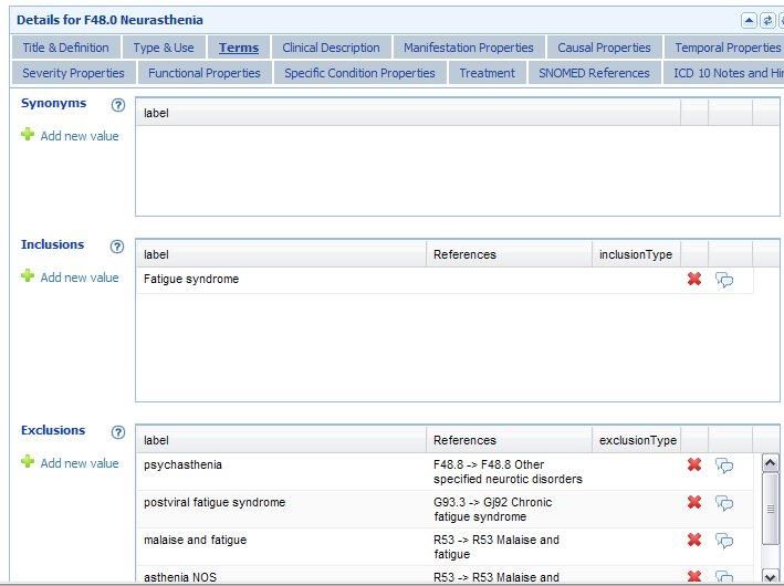 Details: Inclusion terms appear in the tabular list of the traditional print version and show users that entities are included in the relevant concept. All of the ICD-10 inclusion terms have been imported and accessible in the iCat. These are either synonyms of the category titles or subclasses which are not represented in the classification hierarchy. Since we have synonyms as a separate entity in our ICD-11 content model, the new synonyms suggested by the users should go into the synonyms section. In the future, iCat will provide a mechanism to identify whether an inclusion is a synonym or a subclass.