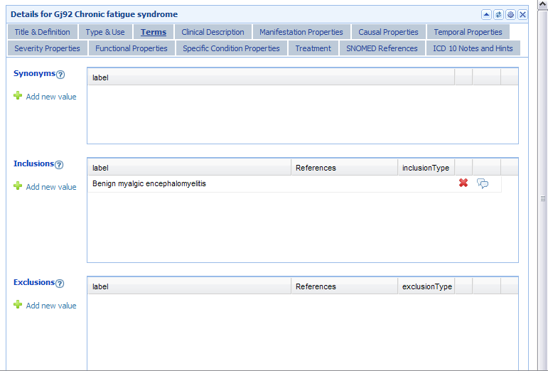 that Gj92 Chronic fatigue syndrome is an ICD Title term with a Details page, a Definition and an Inclusion term (but with no Synonyms or Exclusions or other fields yet populated);