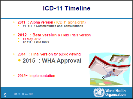 Given the ambitious scale of the project, its technical complexity and with ICD-11 still at the Beta drafting stage, I shall not be surprised if at some point before the end of this year, Revision Steering Group announces an extension to the projected dissemination date or a scaling back of the project, if completion of ICD-11, ICD-11-PHC and several planned speciality versions including Mental health disorders, Paediatrics and Neurology, is to be reached by 2016.