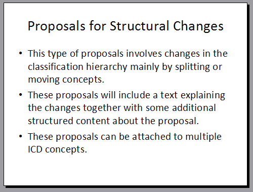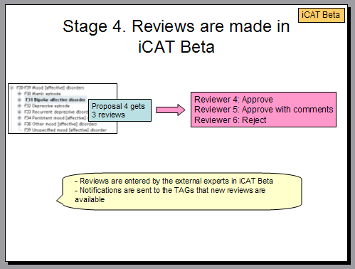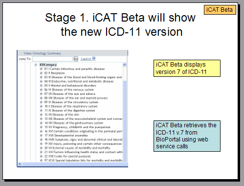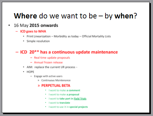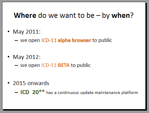 “WHO is revising the ICD to be completed by 2015. It is going to enter into a Beta phase by 2012 May during which all stakeholders could see and comment on the ICD as well as propose changes, test in practice.”