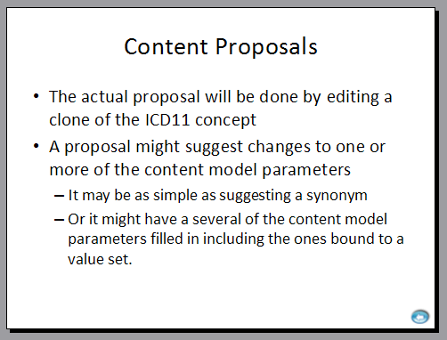 “Population of the Content Model and the subsequent review process will serve as the foundation for the creation of the ICD-11. The Content Model identifies the basic characteristics needed to define any ICD category through use of multiple parameters (e.g. Body Systems, Body Parts, Signs and Symptoms, Diagnostic Findings, Causal Agents, Mechanisms, Temporal Patterns, Severity, Functional Impact, Treatment interventions, Diagnostic Rules).”