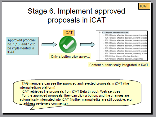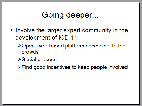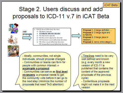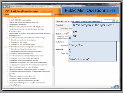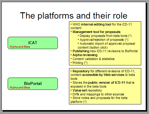 In November, last year, the iCAT collaborative authoring platform through which ICD-11 is being drafted was taken out of the public domain. A revised version of the software on which the platform runs is currently sitting on a Standford server, behind a password, accessible only to ICD Revision. This, or a similar version, may be made publicly accessible (or accessible to those who register for access) from mid May.