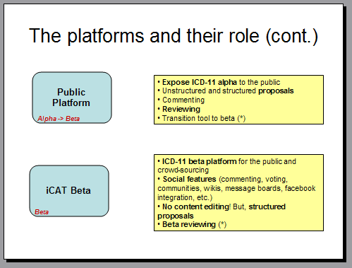 In preparation for the Beta drafting stage, another publicly viewable platform is being developed. According to ICD Revision presentations, this platform will invite and support a higher level of professional and public interaction with the drafting process, with various levels of input and editing authority for interested stakeholders who register for participation. According to editing status, registered stakeholders would be permitted to: