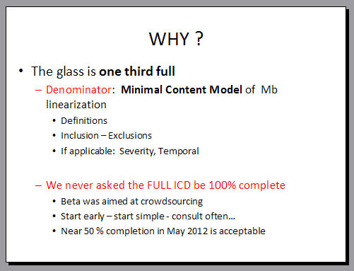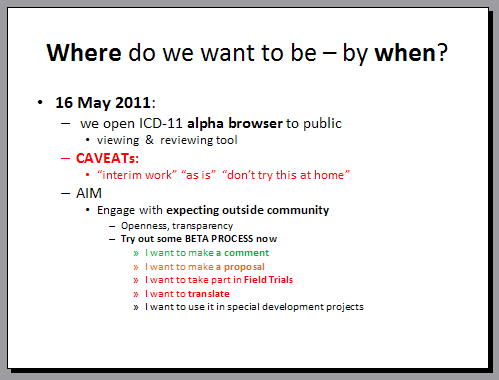 ICD Revision Process Alpha Evaluation Meeting documents and PowerPoint slide presentations, April 19, 2011: http://wp.me/pKrrB-10i