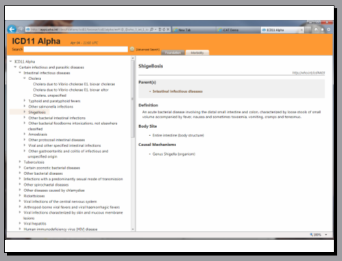 In July 2011, this platform was opened up to professionals and other interested stakeholders who can register via the site for fuller access and for reading and submitting comments. See the ICD-11 Alpha Browser User Guide for information on how the Browser functions and how to register for increased access. (This is the Alpha/Beta “hybrid” referred to in the WHO-FIC Council conference call report, February 16, 2011: Page 6: PDF for Report)