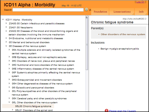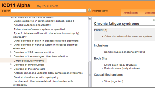 For example, in June to November 2010, the iCAT Alpha Draft recorded a change in hierarchy for PVFS because its parent class “G93 Other disorders of brain” is removed, with ICD Title “Gj92 Chronic fatigue syndrome” listed as a child category of parent class, “GN Other disorders of the nervous system” (see this post for screenshots as they stood at that date).
