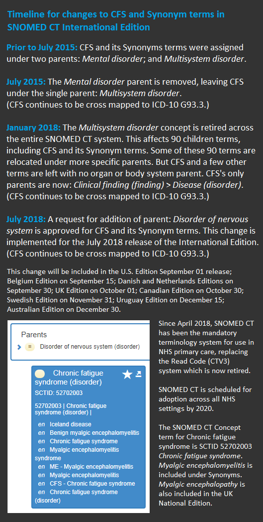 In the March 2020 issue of the ME Global Chronicle, I reported on a request submitted by NHS Digital in November 2019 for addition of the “Systemic exertion intolerance disease (SEID)” term to the SNOMED CT terminology system.