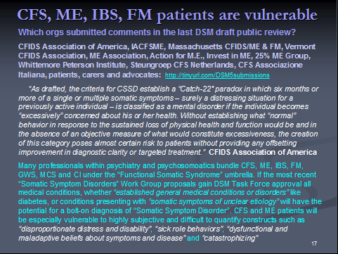 So I consider it will hurt patients to have CFS coded under the R chapter, rather than in Chapter 6: Diseases of the nervous system and that coding CFS under “ill-defined conditions” will render CFS and ME patients more vulnerable to the current proposals for the revision of the “Somatoform Disorders” section for DSM-5 [4].