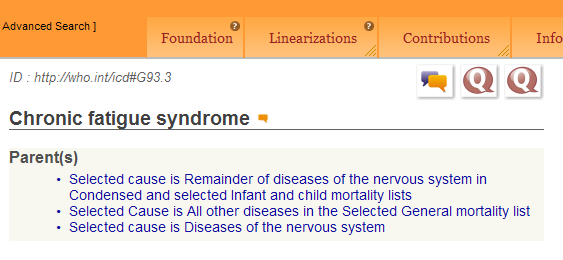 In the Foundation view only, for Chapter 6: Diseases of the nervous system, “Chronic fatigue syndrome” is listed as a Title term with the ICD-10 legacy ID “ID:http://who.int/icd#G93.3”;