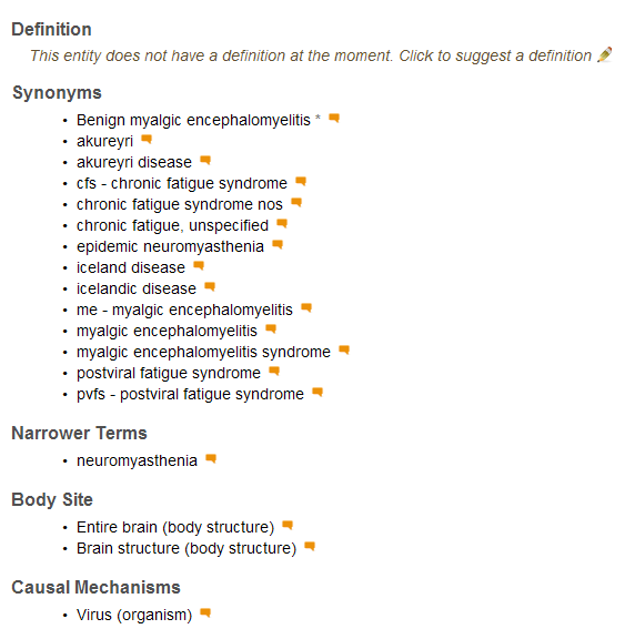 (Note: there is a small asterisk at the end of term “Benign myalgic encephalomyelitis” which is listed at the top of the “Synonyms” list. The asterisk “Hover text” reads “This term is an inclusion term in the linearizations.”)